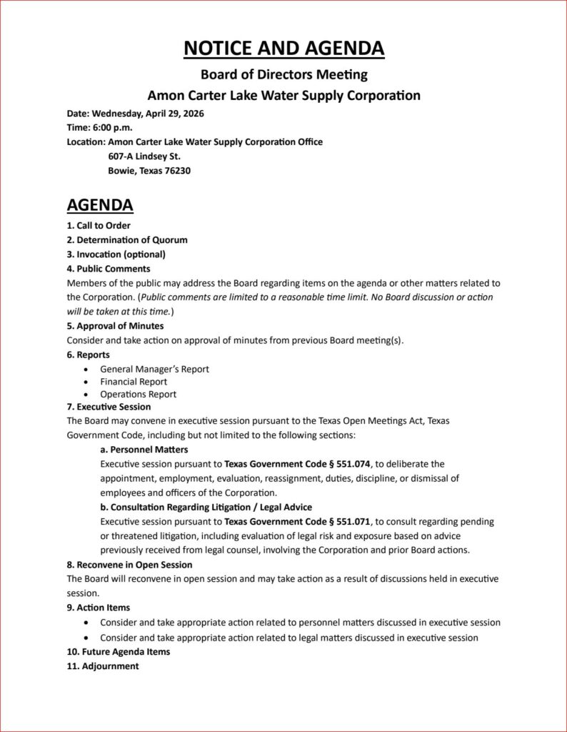 Notice To All Amon Carter Lake Water Supply Corporation Members